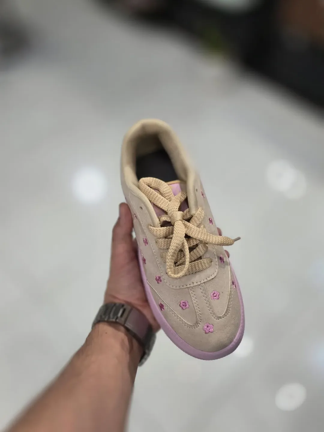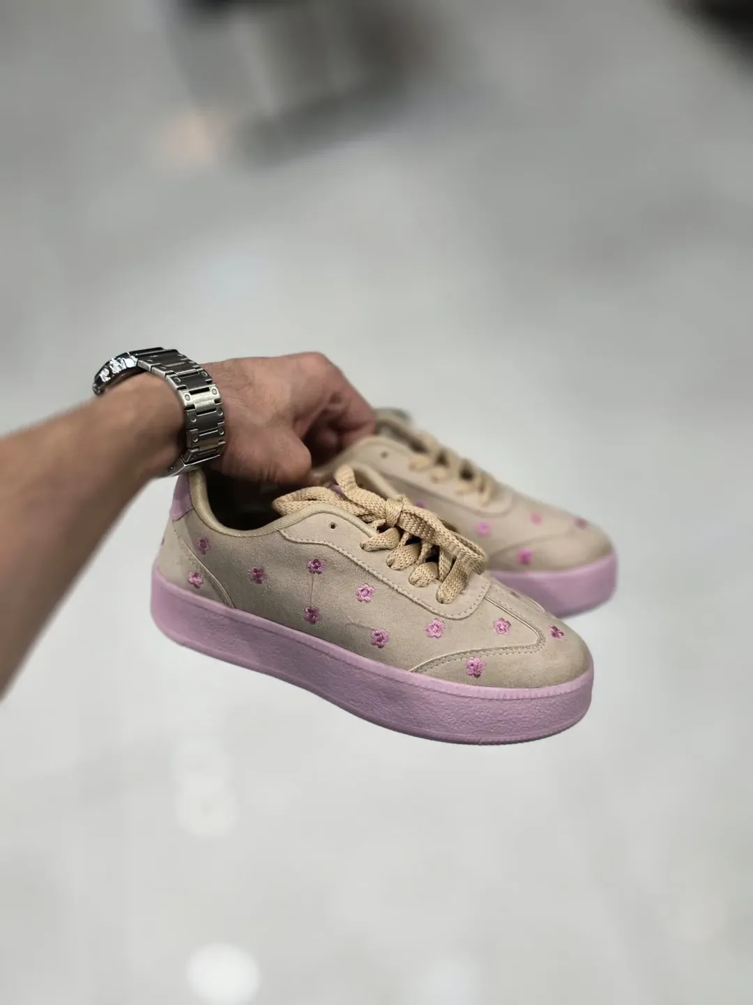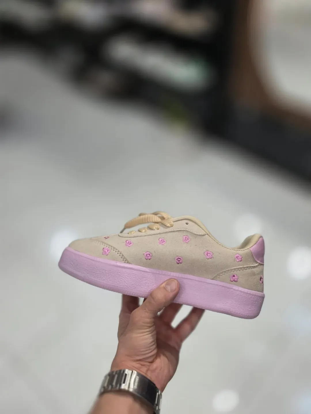 این کتونی با رویه مخملی روشن و گلدوزی گلهای ظریف صورتی طراحی شده؛ ترکیبی دخترانه و مینیمال که از شلوغی دوری میکند. زیره ضخیم صورتی، علاوه بر زیبایی، راحتی مناسبی برای استفاده روزمره میدهد. اگر دنبال کفشی متفاوت و جذاب هستی، این مدل انتخاب معقولی است؛ خوشسلیقه و امن برای استایل کژوال.